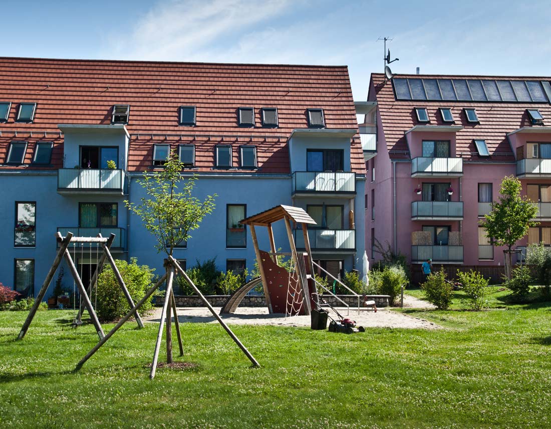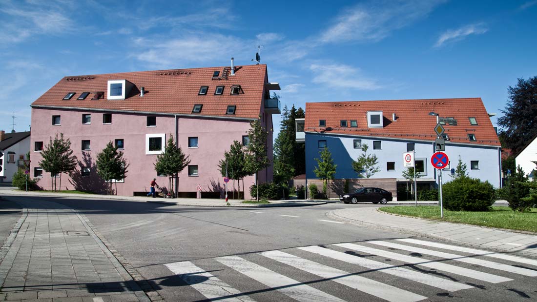 Die bestehende Wohnanlage aus den 30er Jahren an der Münchener Straße / Joseph-von-Hirsch-Straße, wird durch zwei neue Wohngebäude mit nachhaltigem Energiekonzept ergänzt. Die Orientierung der Dachtraufen am Geländeverlauf ermöglicht eine optimale Ausnutzung der Dachgeschosse und lässt die beiden Wohnhäuser als unverwechselbares Ensemble erscheinen. Es entsteht ein, den Wohnungen zugeordneter begrünter Hof, mit Kinderspielplatz und Aufenthaltsfunktionen.